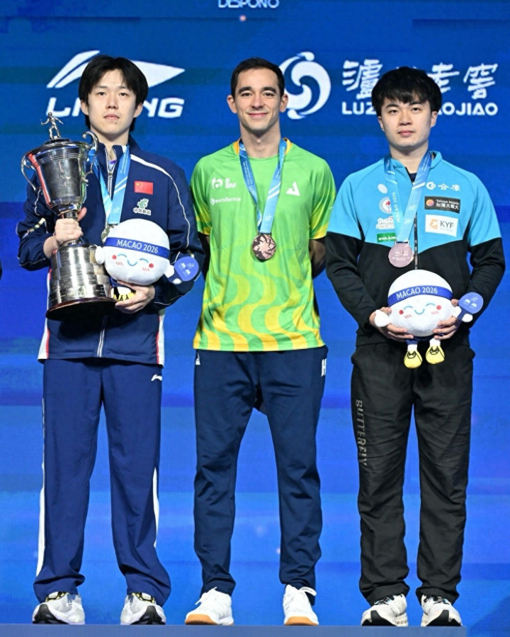 事情要从2026年4月5日说起。当晚,澳门乒乓球世界杯男单决赛上演了一场七局鏖战,中国选手王楚钦以4比3险胜日本18岁小将松岛辉空,夺得职业生涯首个世界杯单打冠军。松岛辉空获得银牌,巴西选手雨果·卡尔德拉诺和中国台北的林昀儒并列获得铜牌。按照颁奖惯例,冠军王楚钦站在领奖台中央,左侧是亚军松岛辉空,右侧是两位铜牌得主雨果和林昀儒。四人同框的画面,本该记录下这个属于全球顶尖乒乓球运动员的荣耀时刻。
