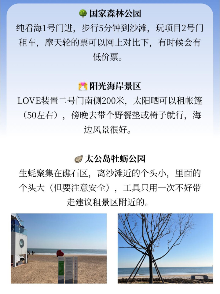 纯看海1号门进,步行5分钟到沙滩,玩项目2号门租车,摩天轮的票可以网上对比下,有时候会有低价票。