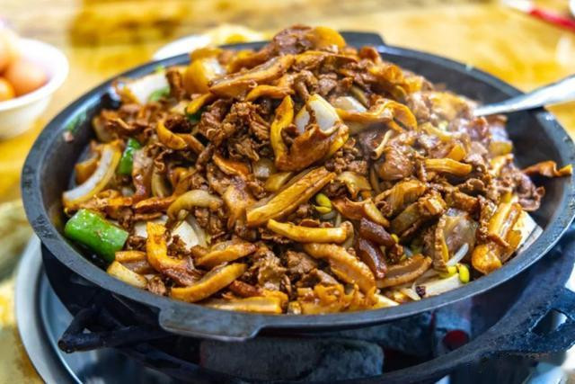 它由多种菜组成,其中羊肉或牛肉或鸡肉是主菜,配菜有各种蔬菜菌子,然后混合一起在铁板火盆里。火盆下方是柴火的燃烧,上方是食物之间的不断交错融合,最终达到一个令人忍不住咽口水的终极目标。