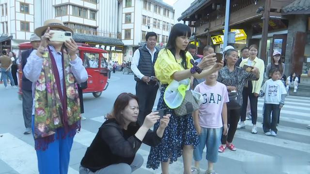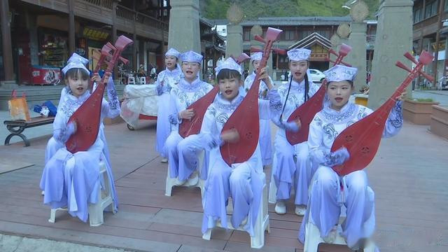 而在十字路口街角的小广场上,一群身着传统服饰的小朋友正抱着琵琶弹唱经典民歌《采花》,清脆的歌声伴着悠扬的琵琶声,宛如清泉流淌,吸引了不少游客驻足聆听,大家纷纷拿出手机记录下这童真又动人的一幕。