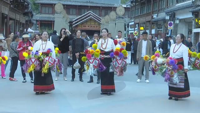 十字路口是最繁华的街区,一场热闹的藏族锅庄正精彩上演。身着民族服饰的当地藏族群众表演起了藏族花灯舞。随着欢快的舞曲和悠扬的歌声翩翩起舞,舞步时而轻快时而豪迈,展现着浓郁的藏乡风情,不少路人被这热情的氛围感染。不远处,一位来自外地的博主正举着手机直播眼前的热闹景象,镜头里有锅庄的欢腾,有美食的诱惑,更有古城的古朴风貌。