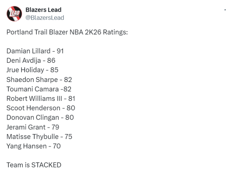 北京时间7月27日,据开拓者媒体Blazers Lead报道,球队核心阵容的2K26能力值已经出炉,利拉德91排名队内第一,杨瀚森70位居队内第11位。