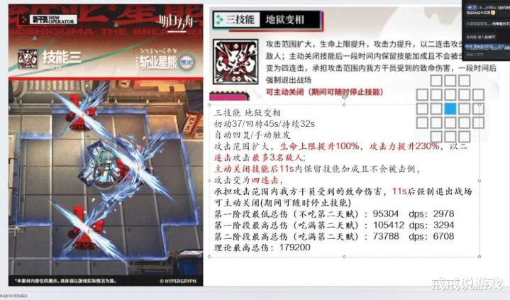 还是来说一说大伙最关心的限定角色异格星熊,从目前资料来看,星熊的潜能一点不加输出的让人有点意外,回转初动也比之前高,8秒初动45回转。 但是生存比想象的强太多了,200%百的假血3551*2*3=21306 没开技能一万血,开技能等效两万血,65的法抗646的防御,脱战回3551*5%=177.55,论生存比带歌蒂的52还强。 正常开技能10左右法伤,启动后备隐藏能源接近18w总伤(理想状态)。单论输出自爆算目前最高伤害,论生存目前最强生存,辅助还有11群体锁血,还能配合新能,初动回转也非常不错,这是不是妥妥的超大上了?
