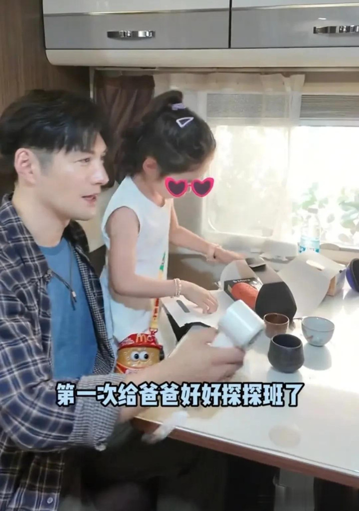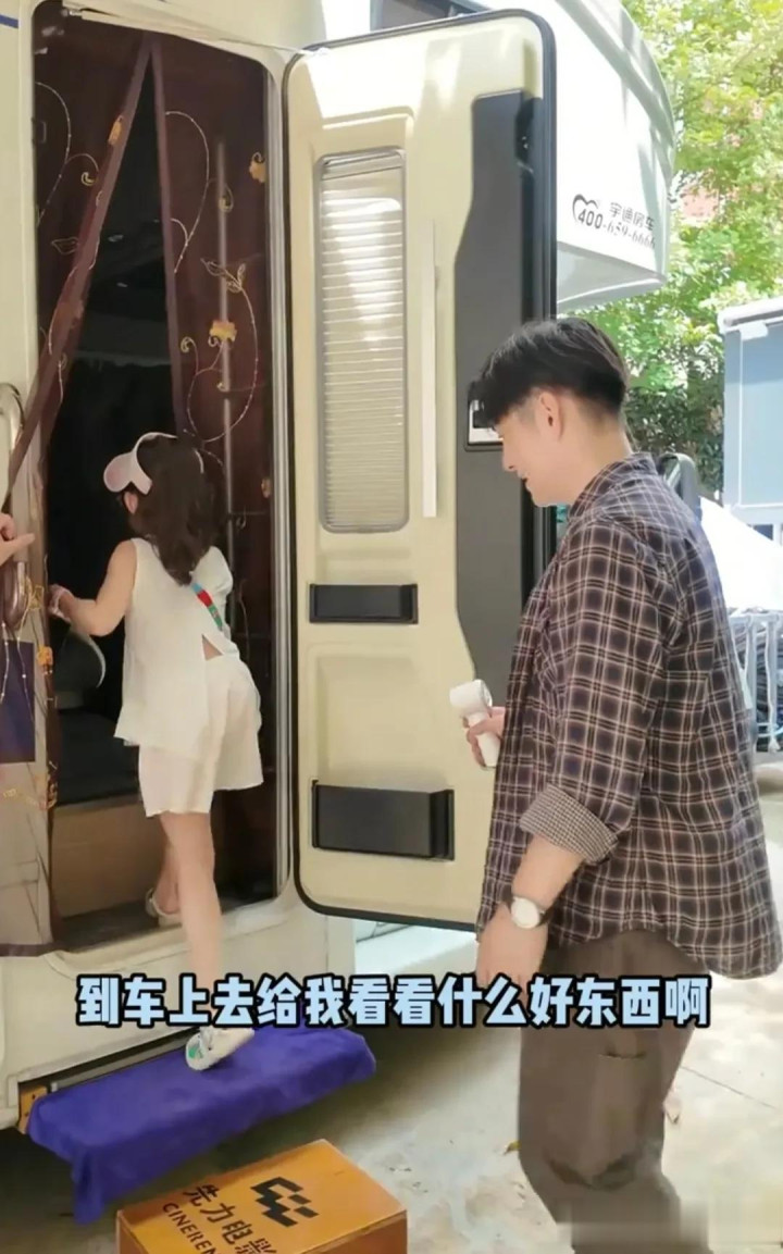 严屹宽对老婆买冷饮的事很满意,带着老婆孩子去自己拍戏的房车上休息,7岁女儿走在最前面,孩子还给爸爸带了小蛋糕,小棉袄特别暖心。