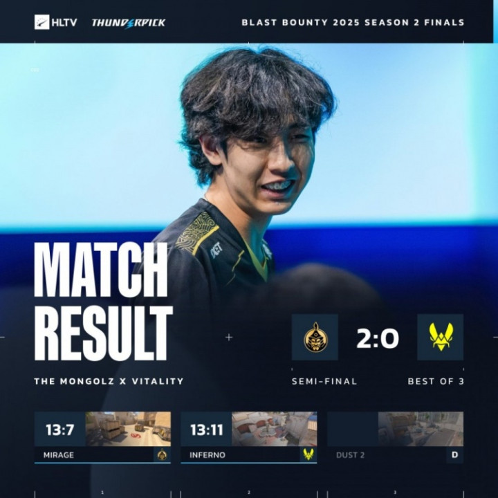 半决赛图一荒漠迷城双方上半时战成6-6平,但下半时蒙古轰出7-1,以13-7赢下选图;图二炼狱小镇,蒙古上半场10-2暴打小蜜蜂,下半场蒙古仅拿1分,小蜜蜂将比分追至11-11,但关键残局Zywoo大狙空枪被bLitz反杀送出赛点,蒙古以13-11横扫小蜜蜂晋级决赛对阵Spirit。