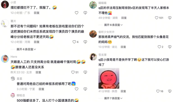 王者荣耀玩家针对这次策划的三个小心机,也是有自己的评价。比如说,有的玩家认为此次版本前瞻,巅峰赛的改动让玩家摆烂都摆不了了,越是高端局,那么100巅峰赛分数就越珍贵。当然了,王者荣耀的演员也是不好过啊,一旦被举报演员的话,轻则信誉分和巅峰赛分数不保,重的话就游戏账号封禁。当然了,王者荣耀天眼守护并非是人机,所以后续的巅峰赛和排位赛将会更加完善哦。同时,有玩家直言,Q区小孩哥游戏水平还是厉害,并且Q区玩家的手法不是V区玩家能比的,你们认为对吗?记得有什么想说的话,在留言区跟我交流沟通。