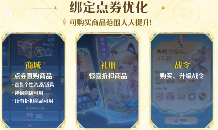 为什么王者荣耀策划这么早就曝光S41赛季的内容,主要还是对自己的调整很有信心啊。的确,王者荣耀宣布的新版本中,估计玩家都很期待吧,甚至S41将会有回归热潮,只因官方三个小心机,最后一个让百万玩家等了九年之久啊。其实呢,王者荣耀的小心机还是蛮多的,这次官宣S41赛季的绑定点券优化,主要是新增了用途。没错,新赛季的绑定点券,可以用来商城道具和神秘商店可用,另外礼册折扣的商品,以及荣耀战令升级,也都可以用绑定点券来用哦。这个改动,让绑定点券的用途更加广泛,而且价值也提升了不少哈。