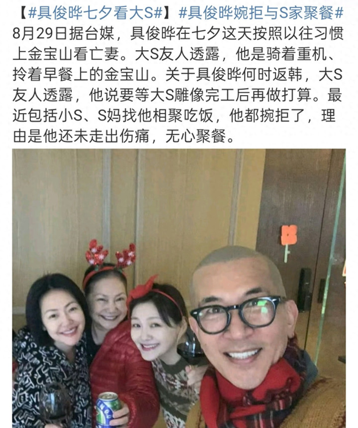 具俊晔拒绝的理由是他还没走出失去大S的伤痛,没心思和人聚餐,就算是大S生前最亲近的家人,他也不想见。