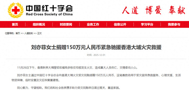 12月1日下午,中国红十字会官方网站发文,公布著名演员刘亦菲捐赠150万元人民币,驰援香港大埔火灾救援。
