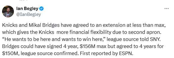 尼克斯记者Ian Begley报道,布里奇斯原本可以签下4年1.56亿美元顶薪合同,但最终他同意降薪续约,消息人士透露,布里奇斯想要留住尼克斯,也想在这里赢得胜利。