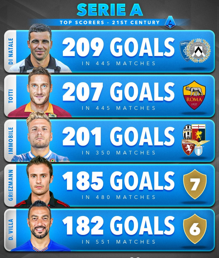 如今,在距离超越托蒂和迪纳塔莱不过就是9球的情形下,想必等待因莫比莱的时间不会太久。而一个很简单的原因就在于,这可是曾经单赛季打进36粒联赛进球而追平意甲纪录的那个男人啊!