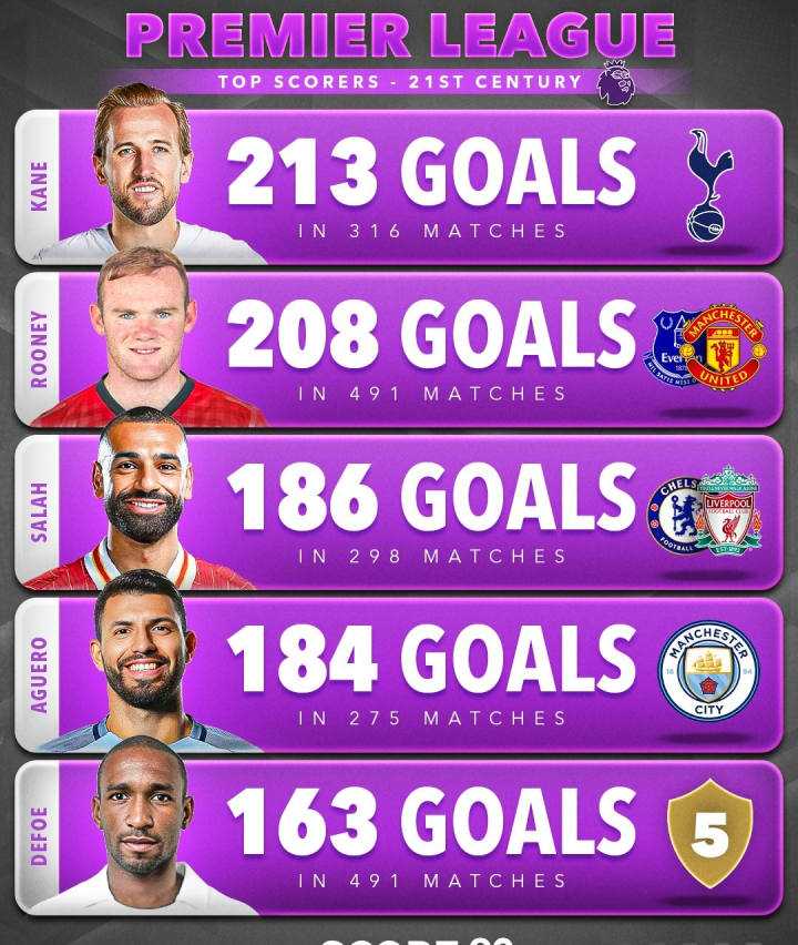 目前的情形是,萨拉赫距离身前的鲁尼只差22球,而距离凯恩则是27球。所以,如若按照上赛季萨拉赫38场联赛打进29球的情形来看,他的确有可能在新赛季成为英超21世纪的射手王。