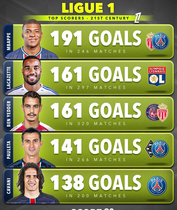 至于像法甲的纪录虽不过191球,但考虑到法甲大多都是跳板的情形来看,姆巴佩这个纪录还没有可能会被打破了!