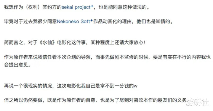 片冈智当然也发表了电影化的感想。但根据他的说法,身为原作者的片冈智,此次电影化其实是拿不到一分钱的。这或许也是在暗示,《水仙》这个IP,从版权层面来说已经跟他没有多少关系了。