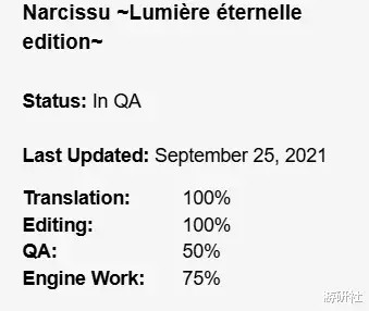 世界工程的官网,把他们负责的所有游戏以及项目进度全部列举了出来。我们可以看到,2021年9月,《水仙》实体移植版的文本翻译、润色校对已经100%完成,只剩QA和引擎相关工作。