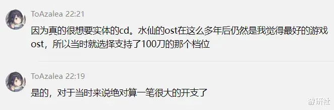 ToAzalea告诉我们,十年前的他还是高中生。当时他上的是国际学校,没有信用卡的他还专门找朋友借来了一张能跨国支付的信用卡。他为这个项目捐赠了125美元,只为拿到他梦寐以求的《水仙》实体OST。