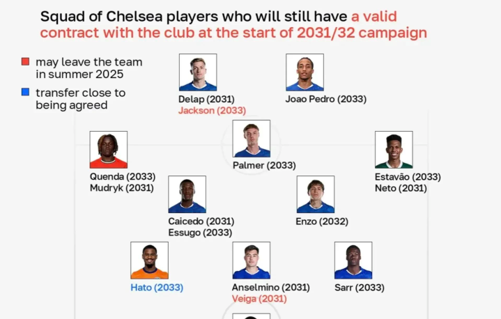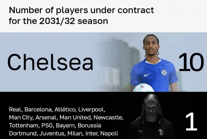 若将目光投向更远的2031/32赛季,对比则更加惊人:切尔西有10名球员合同在身,其他俱乐部加起来仅有1人!