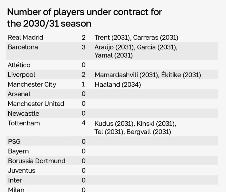 阿森纳、曼联、纽卡斯尔、巴黎圣日耳曼、拜仁、多特蒙德、尤文图斯、国际米兰、AC米兰和那不勒斯甚至一份都没有。切尔西最接近的"追随者"是其伦敦对手热刺,他们有4份此类合同。