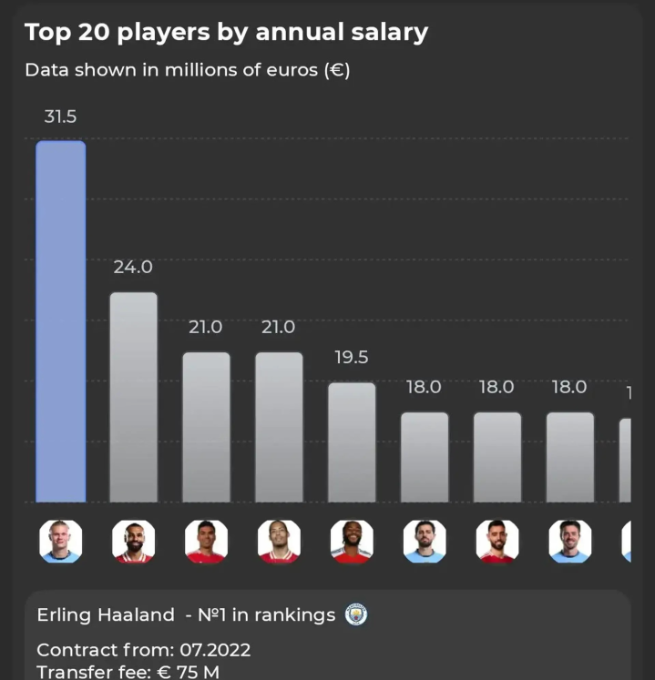 这唯一一人是哈兰德,他与曼城的合同签至2034年——英媒称之为体育史上最昂贵的合同之一。在英超内部,哈兰德无疑是长约之王。
