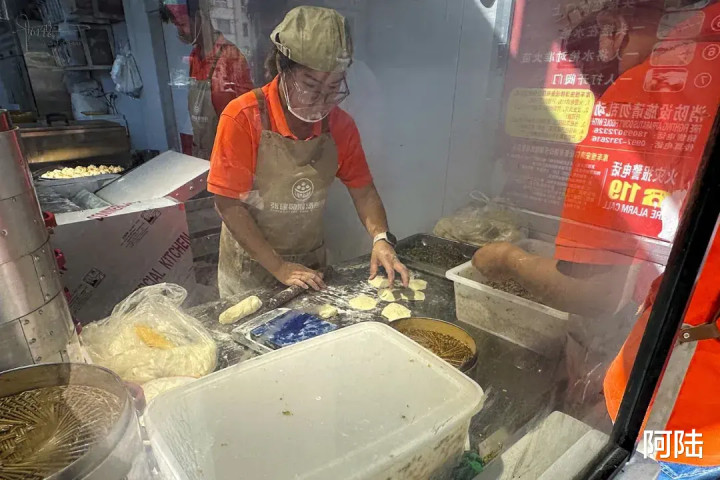 目测这家包子铺还是颇有点规模的连锁品牌,无论环境还是订餐出餐,都被分工明确的店员处理得井井有条,当时给我的第一印象就是“生意繁忙、效率奇高”,无论管理还是服务,都完全跟沿海大城市接轨,所以对库车也是颇生出几分好感。通过柜台上的大玻璃,可以看见几位店员正麻利地擀面皮,包包子,忙得不亦乐乎,而每位到这家早餐店消费的顾客,都能跟我一样,亲眼见证灌汤煎包的出炉过程,厉害吧?
