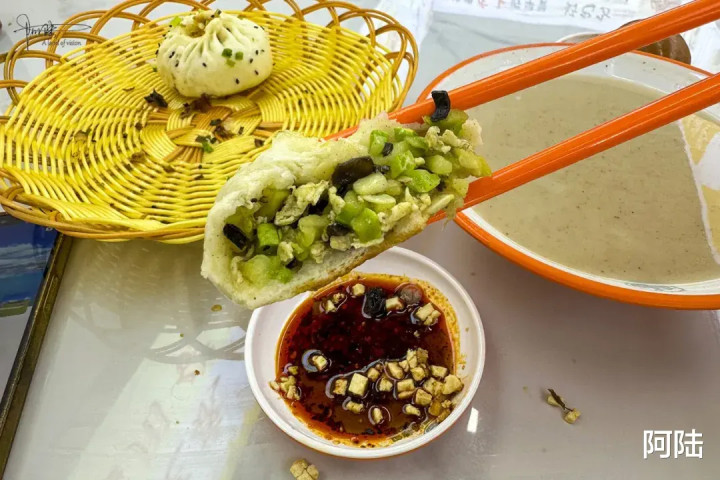 来之前在网上已经订好套餐,所以跟年轻的店员打个招呼,排队扫好码领了小票,没几分钟我的早饭就摆在了面前。四个煎包三种馅,但我最喜欢的还是“香菇肉丁包”和这种纯素的“四季豆豆腐丁咸菜包”,哈哈,当地叫法应该是很简洁的,只是我忘记了而已。有趣的是无论茶叶蛋还是杂粮豆浆还是煎包,都极具江南风味,相信浙江人到这里吃早饭,都很能适应和喜欢。