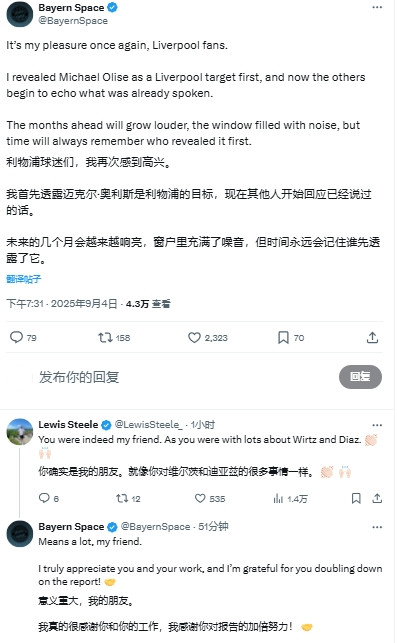 此外斯蒂尔认可了拜仁博主BayernSpace的报道,此前该博主透露奥利塞有略低于1亿镑的解约金,但被德国媒体一致否认。
