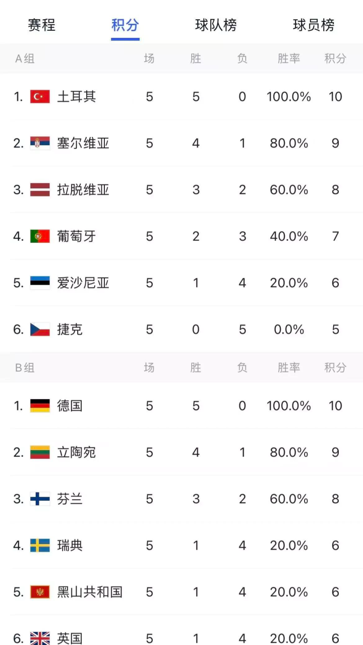 A、B两组的最终积分排名如下: