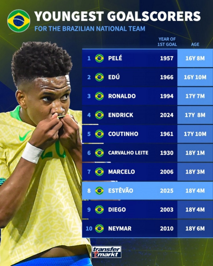 巴西最年轻进球榜: 贝利16岁8个月居首 大罗&内马尔&埃斯特旺在列