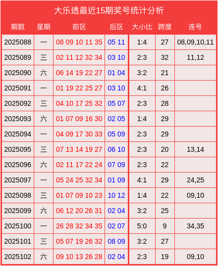 当期前区大小比为2:3,跨度为19,开出1组连号09,10