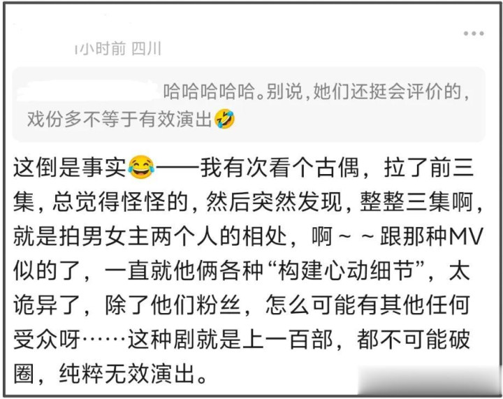 围观了何赛飞吐槽,网友瞬间想到了市面上愈发失去吸引力的长剧,所谓大男主、大女主剧就是主角独角戏,要不就是男女主二人转,所有角色都为主角服务,剧情没逻辑、人物没塑造,拍出来纯属粉丝特供,敢情根源都在让戏啊!