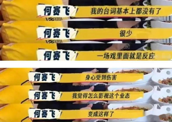 为了避免粉丝不高兴,何赛飞无奈让了戏,明明剧本都写好了,但她还是要减少台词,给流量演员更多镜头,甚至有时候一场戏几乎没台词,只剩下反应,还不一定有镜头,一部戏拍完,何赛飞感觉身心都受到伤害。