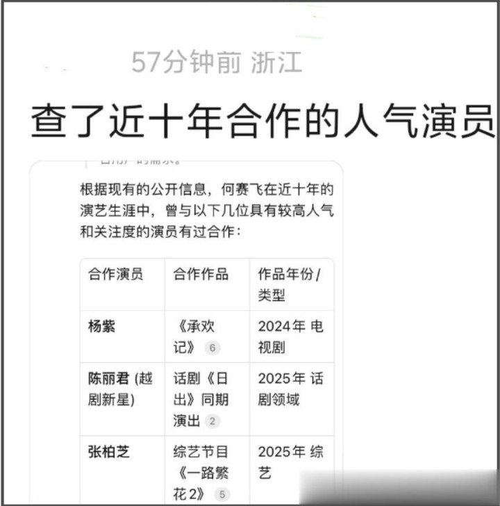 何赛飞没有点名道姓,有网友顺着她的作品开扒,发现何赛飞近年合作过的演员,称得上流量的并不多,最为知名的竟然是90花杨紫。