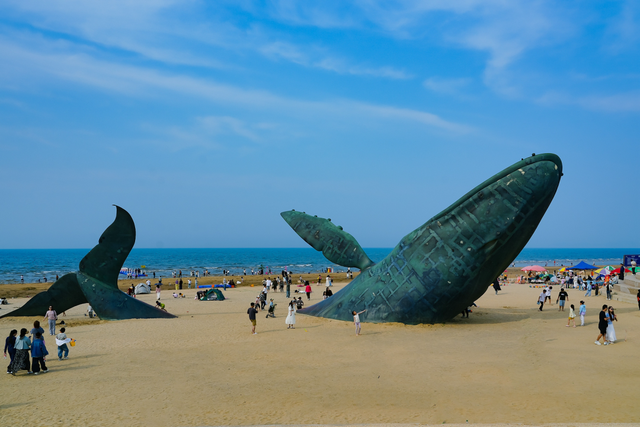 烟台金沙滩海滨公园有一座鲸鱼雕塑。(图/视觉中国)