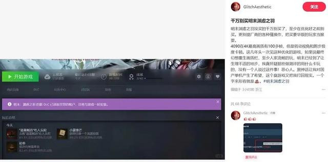 要说为何《明末:渊虚之羽》在上线后为何如此迅速地掉口碑,这其中则要和游戏优化问题有很大的关系,在steam评论页面就可以看到,很多玩家都在吐槽游戏的“灾难级优化”,而隔壁小某书上更是有玩家分享自己4090显卡4K高画质跑起来只有100多帧,并且游玩过程中能感受到明显卡顿。
