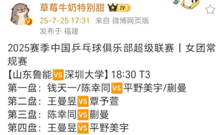 距离比赛开始还有不到一个小时,刚刚看到山东鲁能和深圳大学的具体对阵表出来了,今天山东鲁能抽到了主场,比赛在3号台。想看比赛的可以在咪咕或者抖音看,抖音的博乒网五个球台的比赛都可以看。一起来看一下山东鲁能和深圳大学的具体对阵表: