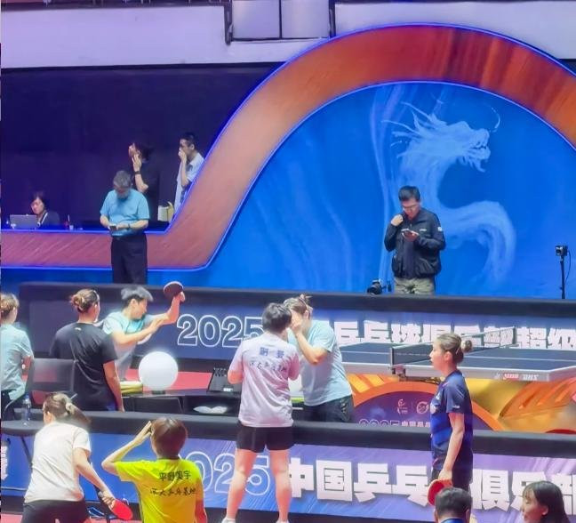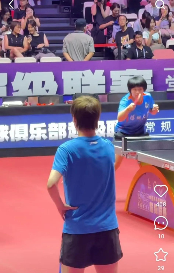 看到有在现场球迷拍的, 目前莎莎还没有入场,今晚两场女团的比赛在相邻的球桌,看到蒯曼过去和孙铭阳聊天了,阳阳还捂着嘴说悄悄话了,刘炜珊也在那里看球。这要是莎莎来了,高低得和阳阳、佳佳、刘炜珊唠几句。这边看到陈幸同在练球,钱天一在后面看她们练球,平野美宇也在旁边等着。
