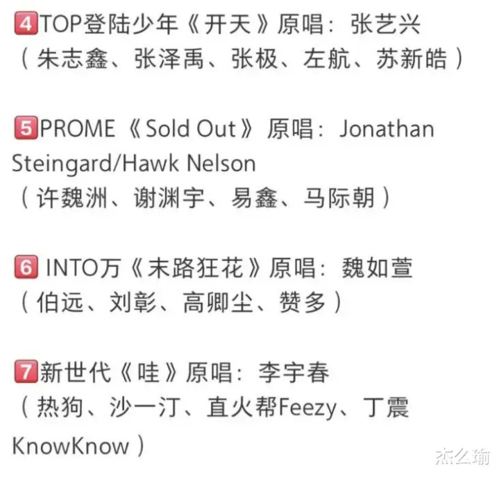 这季《披荆斩棘5》既然搞男团模式,那之前的录制规则肯定就不算数了,后来网上又传出了第一轮舞台公演的分组和选曲,我瞅了一眼,大湾区选了《开始懂了》,快乐老咖团选了《一人行》,INTO1那组选了《末路狂花》,X-brother团选了《烂泥》,新时代团选了《哇》,Promer团选了《soldout》,TOP登陆少年团选了《开天》。