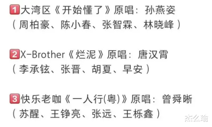 光看选的歌,就能猜出每个团大概走什么风格,不出意外的话,大湾区和快乐老咖团应该更偏向唱演舞台,能把舞台弄得跟讲故事似的,有滋有味,而TOP登陆少年团估计会全程唱跳,毕竟他们年轻有活力,这正是他们的优势。