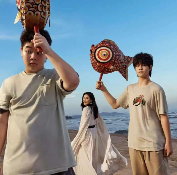 而11岁的小鱼儿,同样穿着咖色的短袖,裤子和哥哥不一样,他穿的是蓝色的短裤,发型和哥哥差不多,都是有些长的头发,不过他的头发刘海没有放下来,全部吹了起来,露出整张脸。