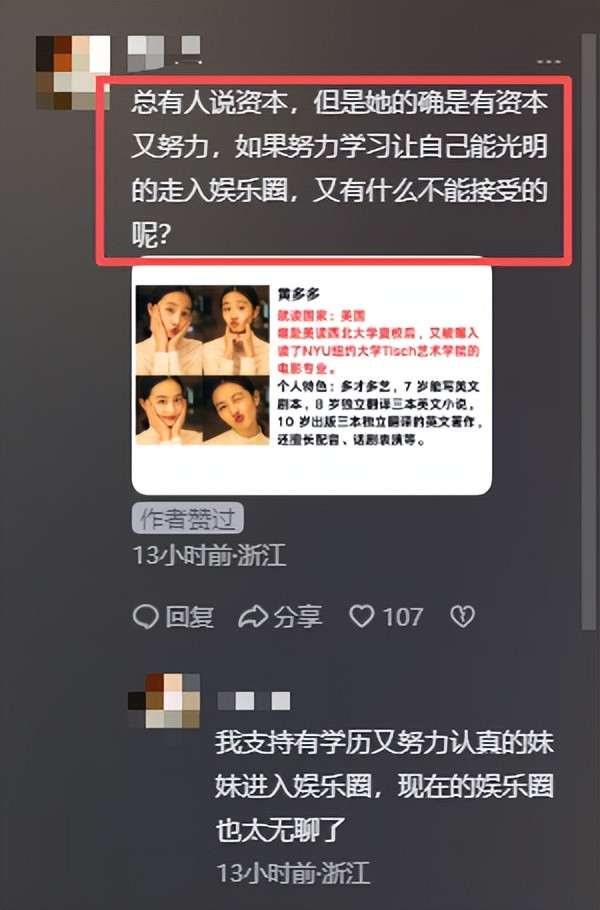 还有人嘲讽她靠父母人脉资源进娱乐圈。