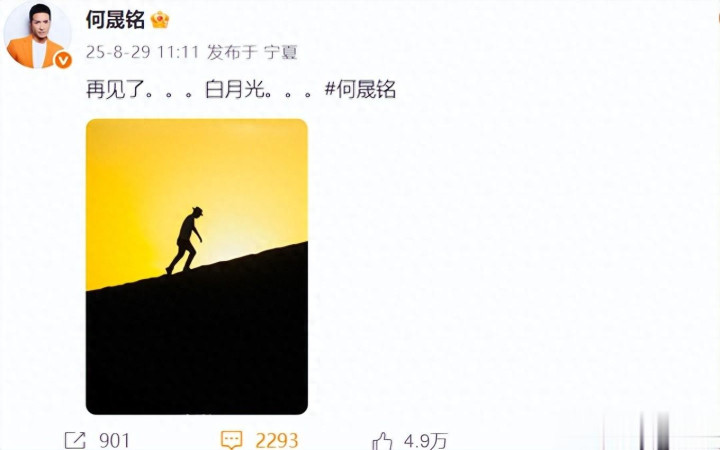 于正沉默的第六天,何晟铭于七夕当日卡点11:11发布日落时分的沙漠背影照,配文“再见了。。白月光。。。”至此,一场闹剧被他升华为一场充满仪式感的郑重告别——这是真的打算不见不欠不念了吗?