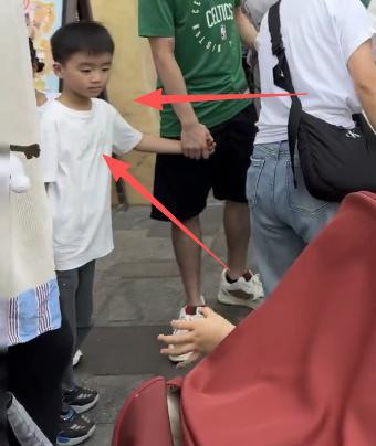 他牵着儿子何广燊的手,小伙子虽然才6岁,但个子已经到了爸爸胸部的位置,身高已经到何猷君胸部了,遗传了妈妈的大长腿。