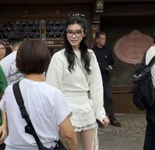 奚梦瑶穿着白色卫衣搭配超短裙,一双大长腿又白又直,完全看不出是两个孩子的妈妈。